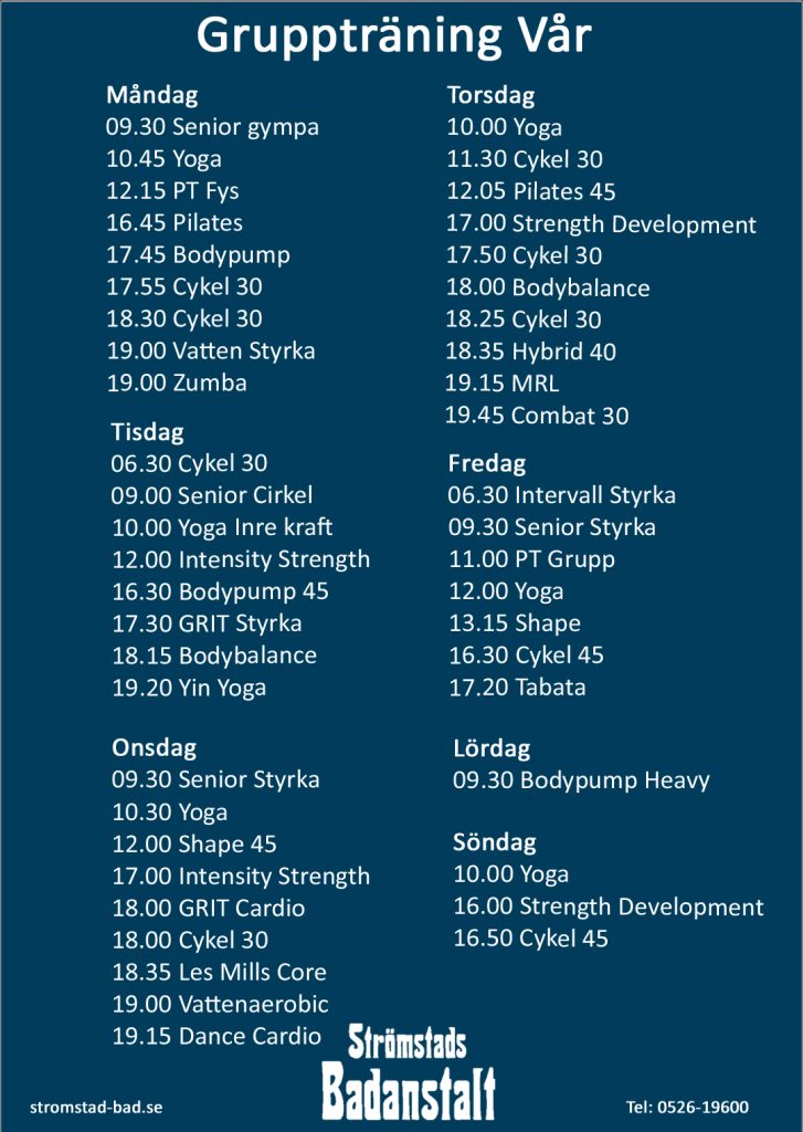 Strömstads Badanstalt erbjuder ett stort utbud av gruppträning som är enkel, rolig, variationsrik och utmanande. Vare sig du är nybörjare eller har tränat länge hittar du en klass som passar just dig. Vår instruktörskår är välutbildad och uppdaterad med det senaste inom träning & hälsa.